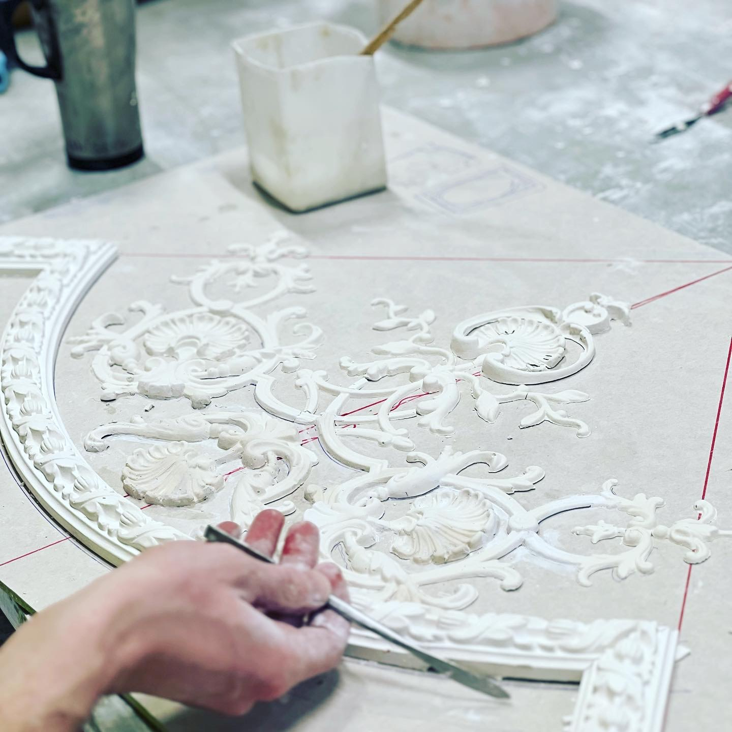 – Vi använder formar från vår bank som passar projektets tidsepok och återanvänder utsmyckningar som matchar både mått och stil. Det är viktigt att bevara fastighetens ursprungliga formspråk. Om det saknas nödvändiga formar skapar våra skulptörer dem. Vid moderna projekt erbjuder vi även ny stuckatur, som ljusramper och profilerade undertak, något som vi tar fram enligt önskemål från kunderna.